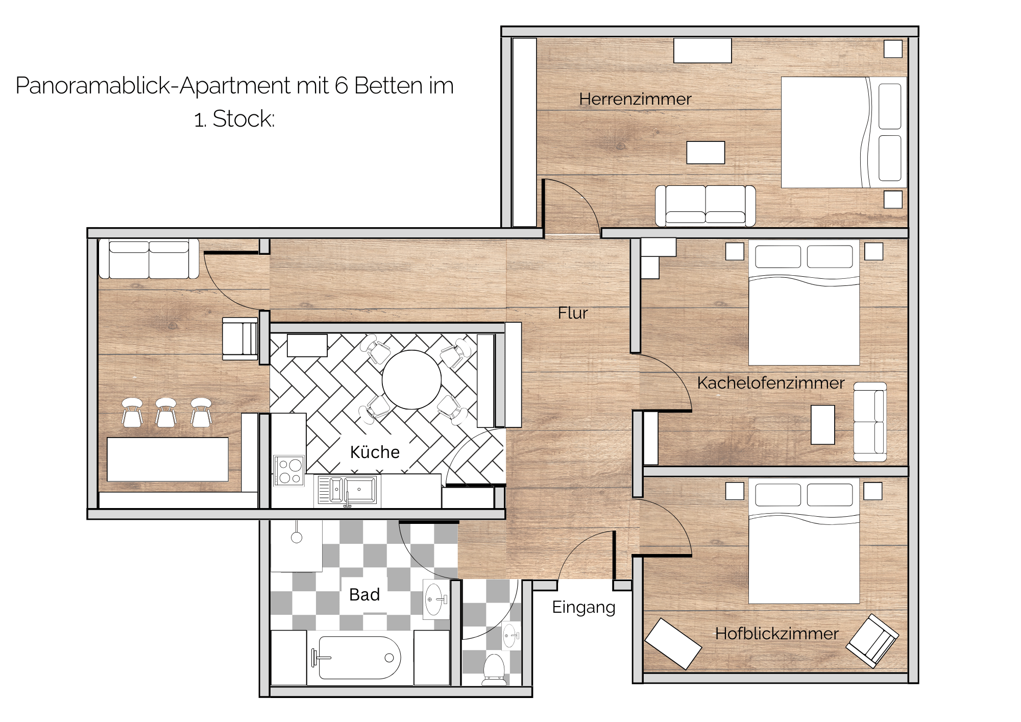 Unser neu renoviertes 150 m² großes Panoramablick-Apartment bietet Ihnen insgesamt 3 Zimmer. Das Hofblickzimmer mit einem Doppelbett. Das Kachelofenzimmer mit einem Doppelbett, sowie das Herrenzimmer mit einem Doppelbett. Außerdem verfügt das Apartment über eine Küche, ein Bad, eine Toilette und einen wunder schönen Aufenthaltsraum mit Panoramablick.