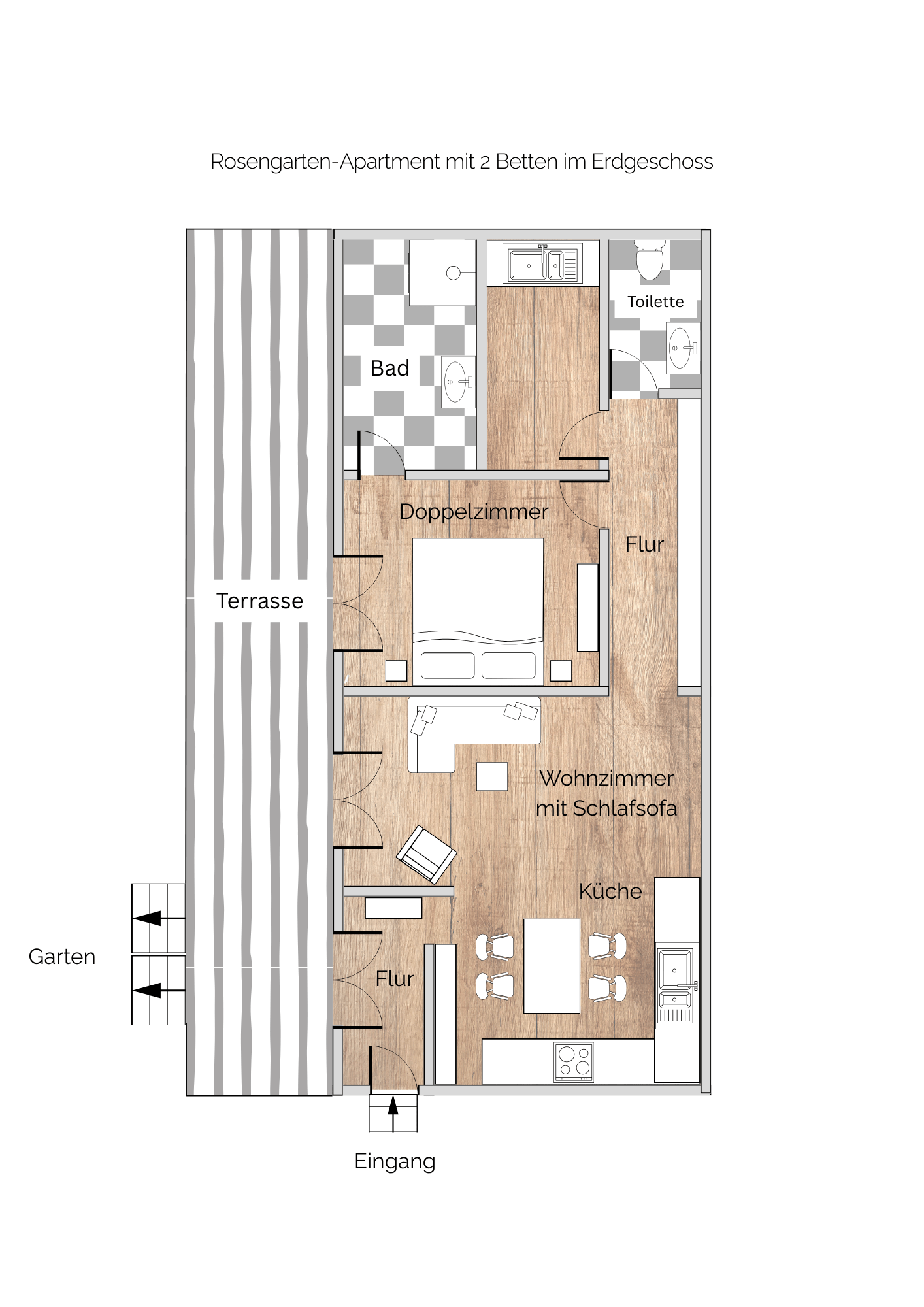 Rosengarten-Apartment mit 2 Betten & einem Schlafsofa im Erdgeschoss: