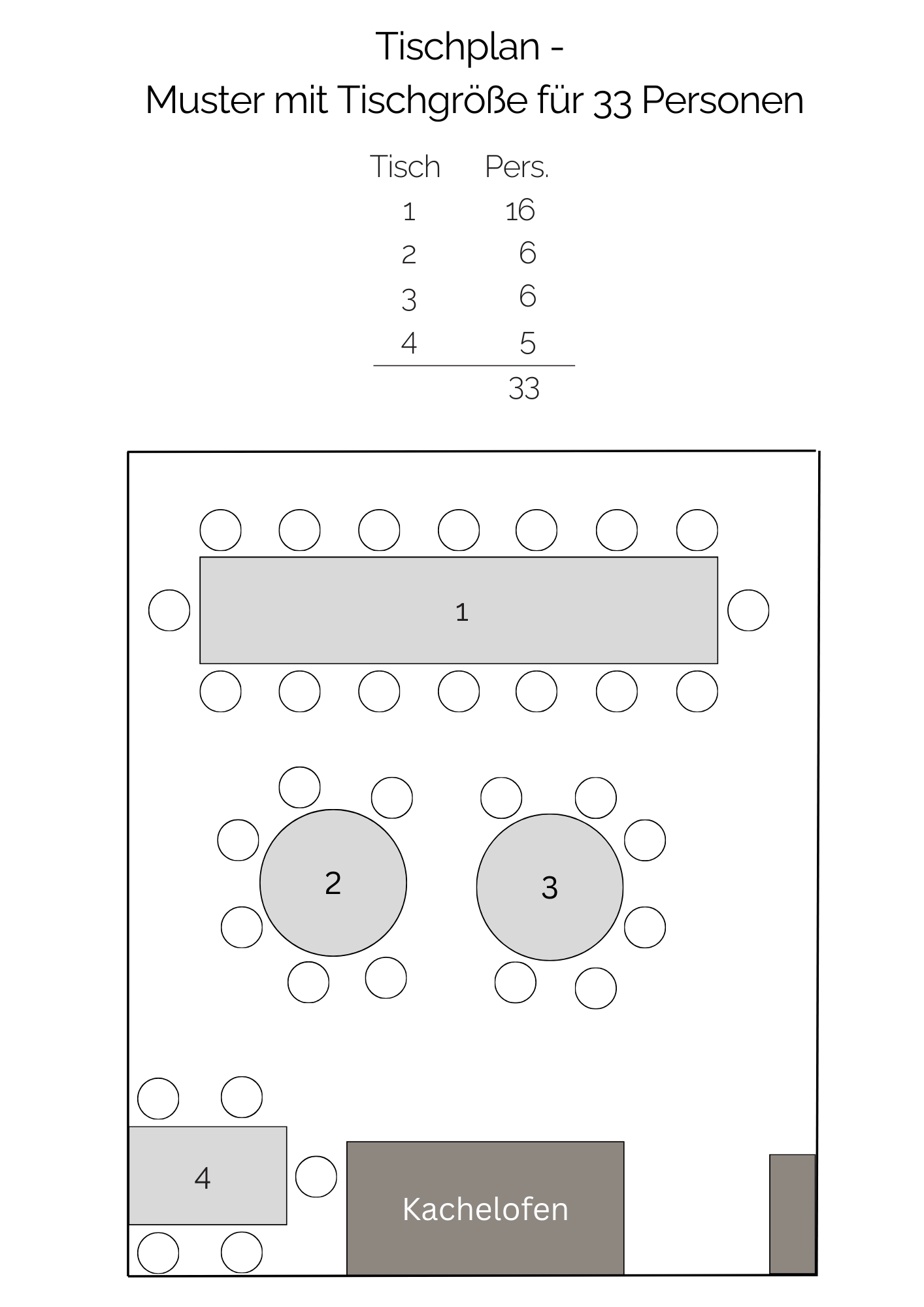 Tisch 1 ist oval und ausgelegt für bis zu 17 Personen.