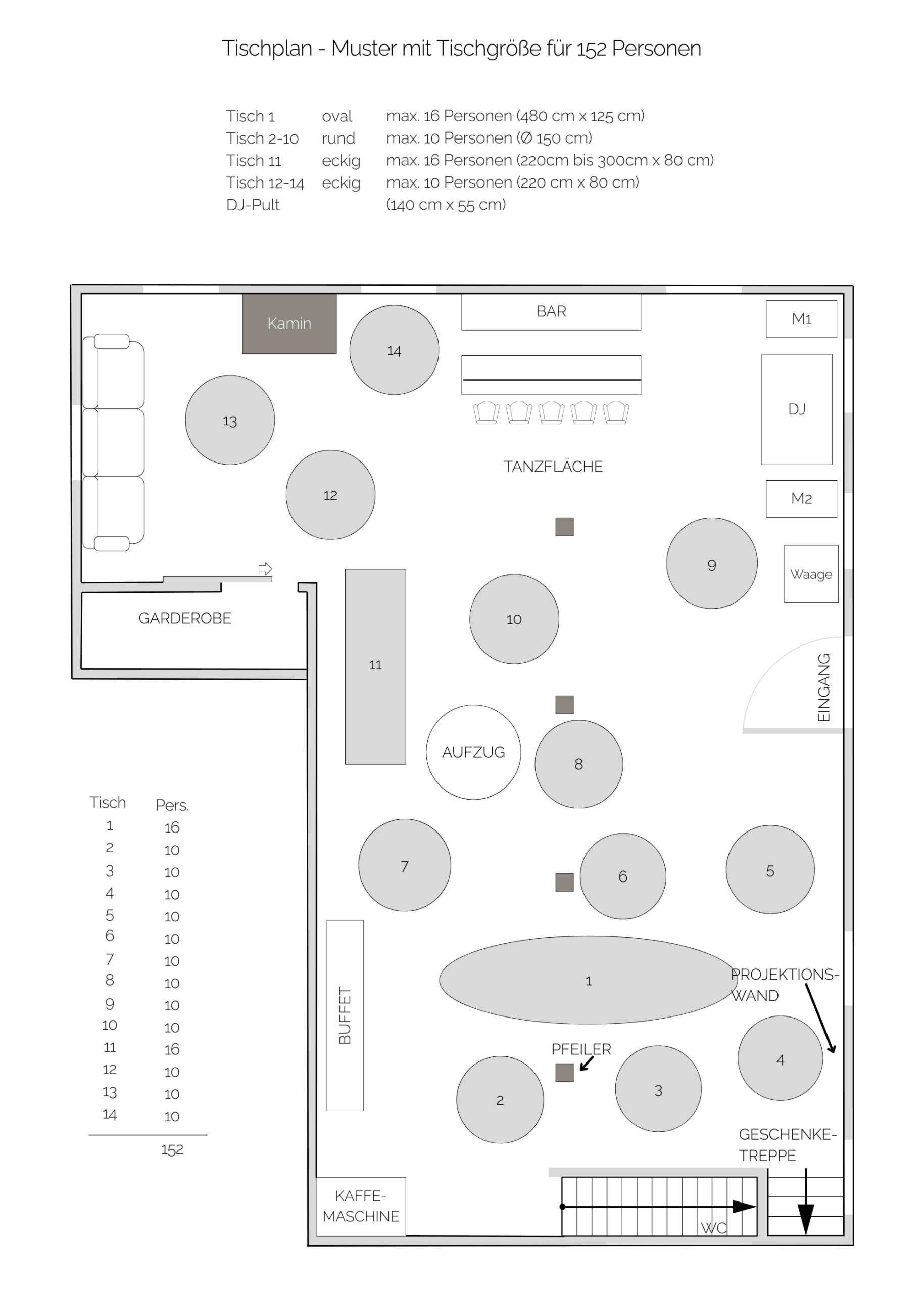 Zur Verfügung stehen 13 runde Tische (Ø 150 cm), optimal geeignet für 8 bis 10 Personen. Bei dichter Bestuhlung finden auch 11 Personen Platz.